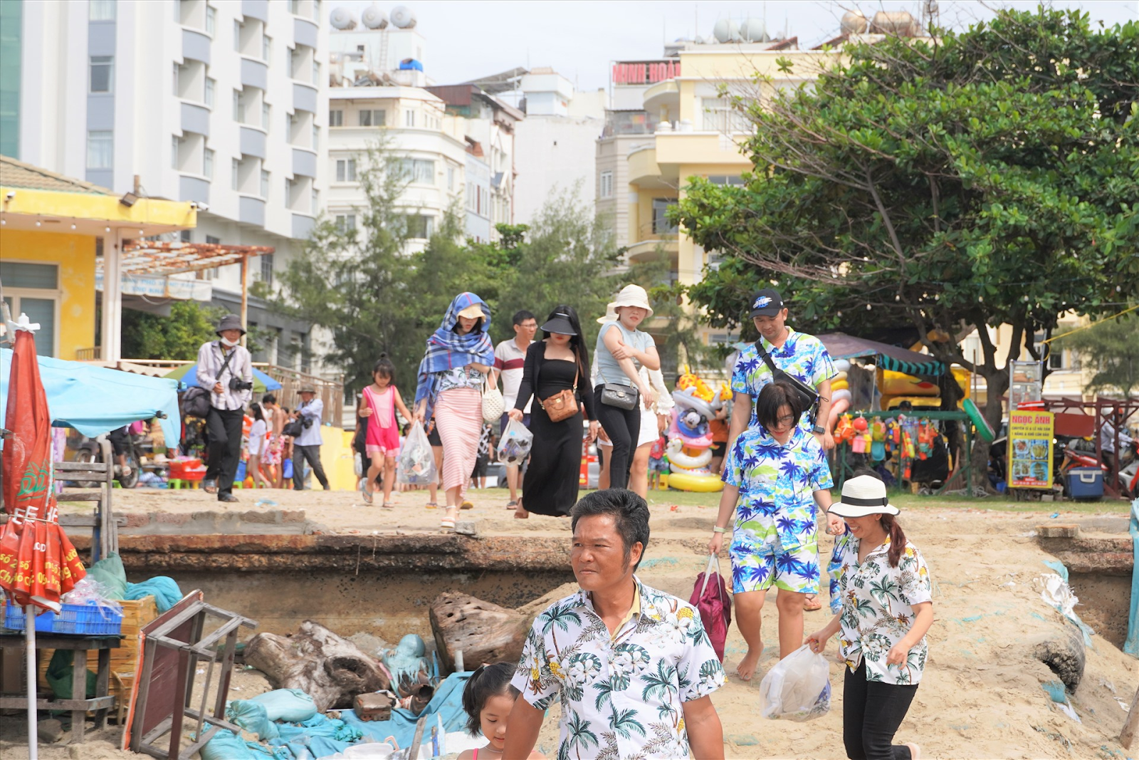 Buổi trưa, du khách dùng bữa tại các quán hải sản hoặc quán ăn địa phương gần trung tâm với các món đặc trưng như lẩu cá đuối, ghẹ hấp, mực xào chua ngọt… Sau đó nhận phòng khách sạn, nghỉ ngơi ngắn để chuẩn bị cho buổi chiều. Đến chiều, di chuyển ra Bãi Sau để tắm biển, dạo mát hoặc chụp ảnh hoàng hôn. Thời điểm này bãi biển khá đông nhưng không khí rất sôi động, phù hợp với không khí du xuân đầu năm.