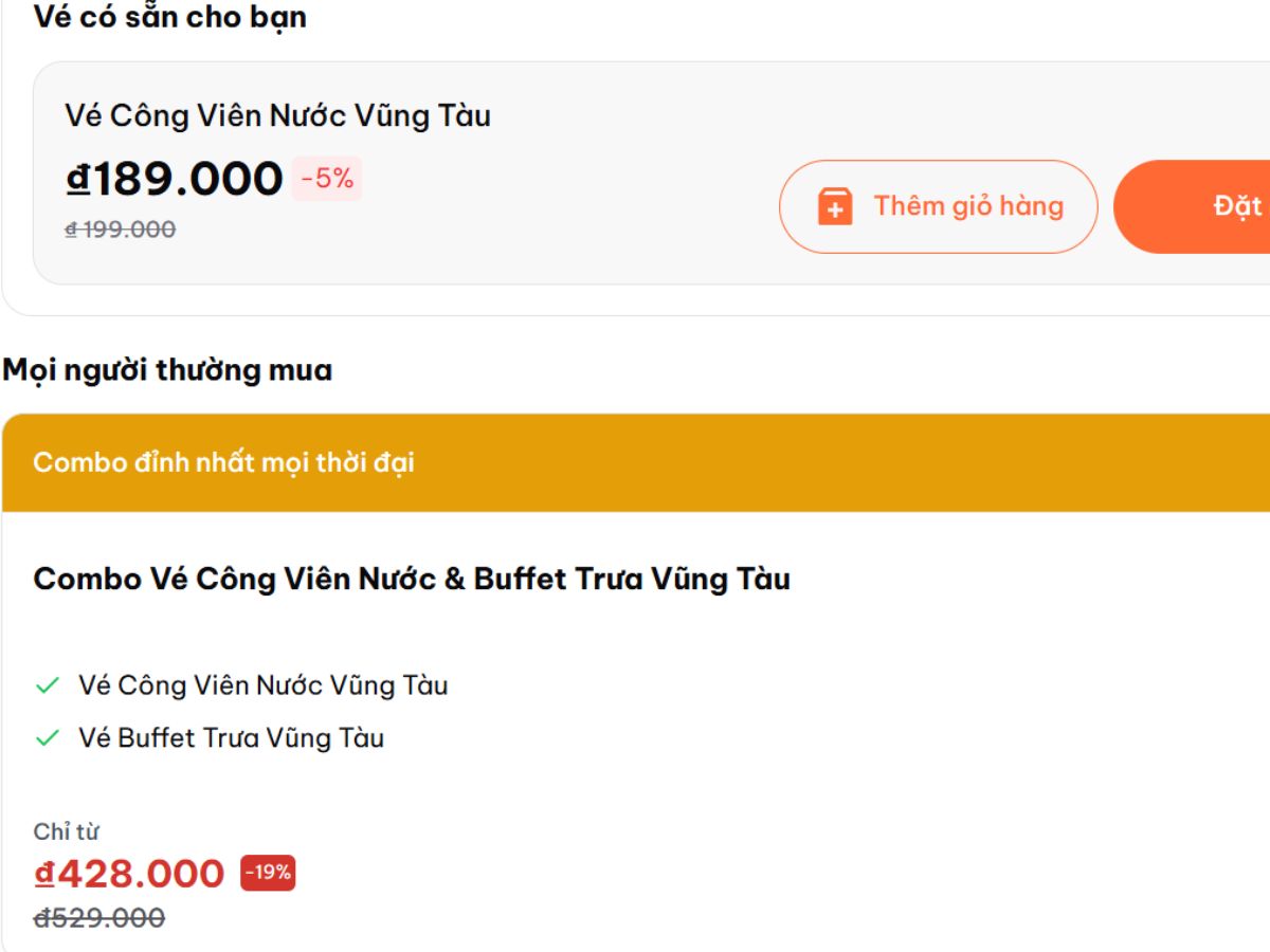 Sau khi vào trang sản phẩm, du khách lựa chọn loại vé phù hợp như vé công viên nước, vé buffet hoặc các gói combo kết hợp. Mỗi loại vé đều đi kèm thông tin chi tiết về quyền lợi và phạm vi sử dụng, giúp dễ dàng so sánh trước khi quyết định.