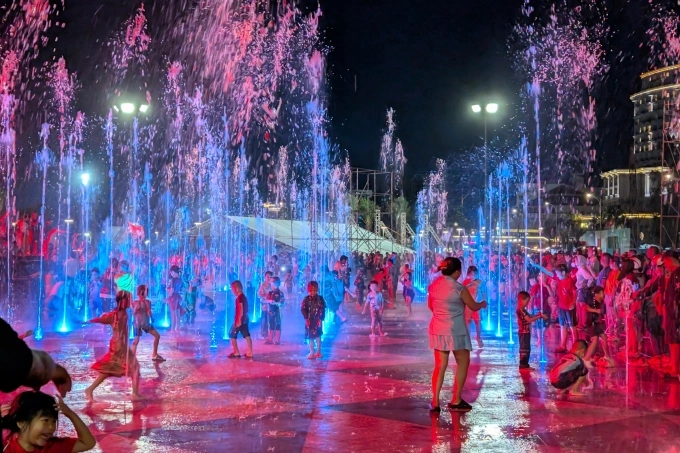 Du khách vui chơi thích thú dưới đài phun nước tại Quảng trường Tam Thắng (Nguồn: Sưu tầm)